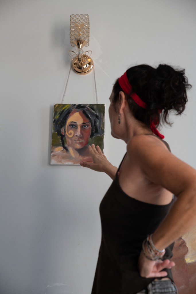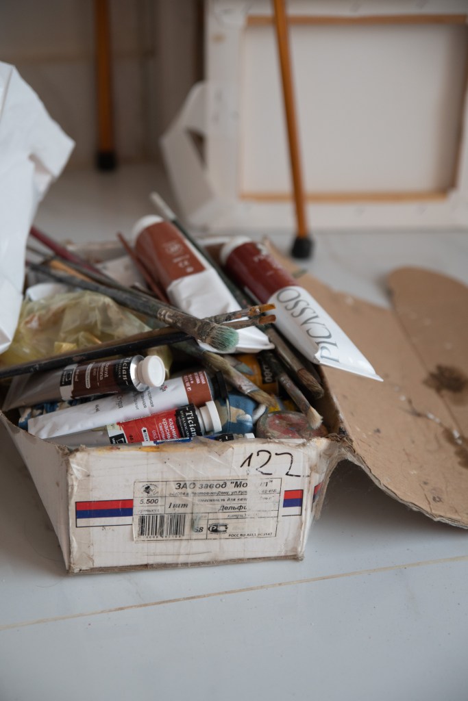 “I can find a lot of trust in my art. Just after the war started I made this painting (1). It signifies what war did to me. I looked horrible in the painting. I hid it for several months. No one could see it. Last month I adjusted the painting. Painted a second layer. Now it signifies a woman that goes on with her life. On towards new adventures.”